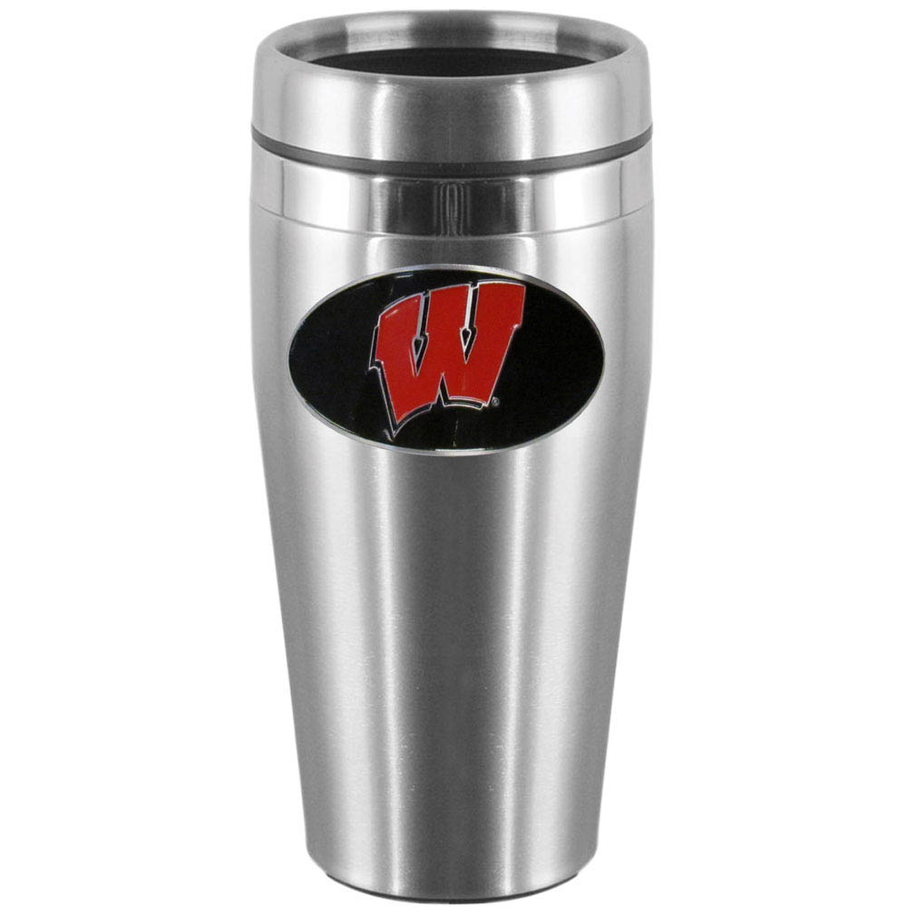 Our high-quality stainless steel travel mugs have a 14 ounce capacity, brushed metal finish and features a metal Wisconsin Badgers emblem.