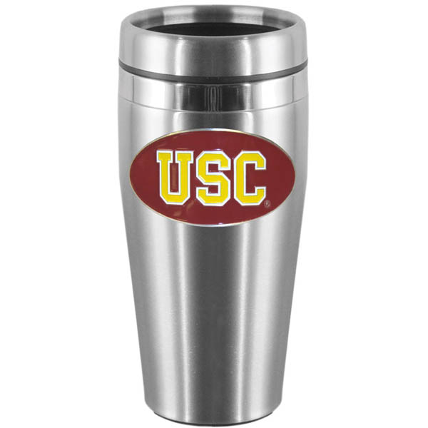 Our high-quality stainless steel travel mugs have a 14 ounce capacity, brushed metal finish and features a metal USC Trojans emblem.