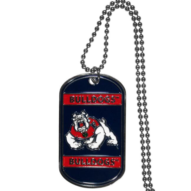 Expertly crafted Fresno State Bulldogs tag necklaces featuring fine detailing and a hand enameled finish with chrome accents. 26 inch ball chain.