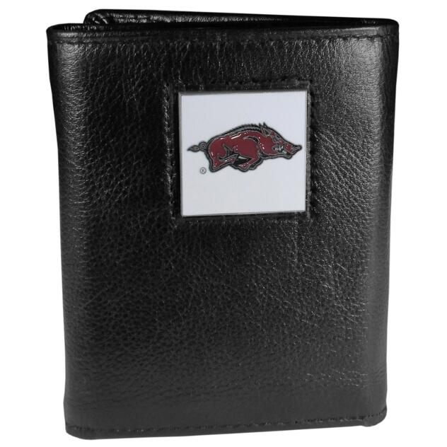 Our officially licensed fine grain leather wallet features numerous card slots, windowed ID slots, removable picture slots and large billfold pockets. This quality wallet has an enameled Arkansas Razorbacks emblem on the front of the wallet making it a stylish way to show off your team pride.