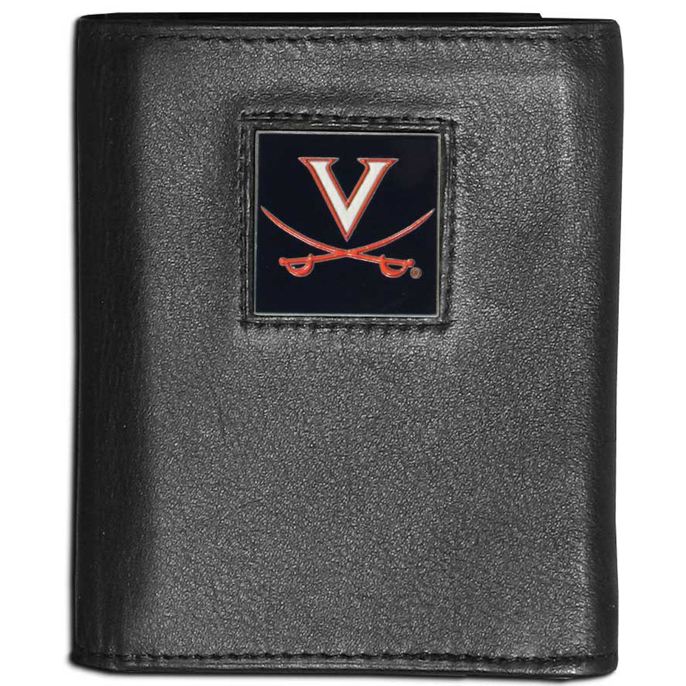 Our Virginia Cavaliers leather tri-fold wallet features a sculpted and hand painted team square on a black leather tri-fold. Includes an ID window, slots for credit cards and clear plastic photo sleeves. For a sporty feel, the liner of the wallet is made with a canvas liner.