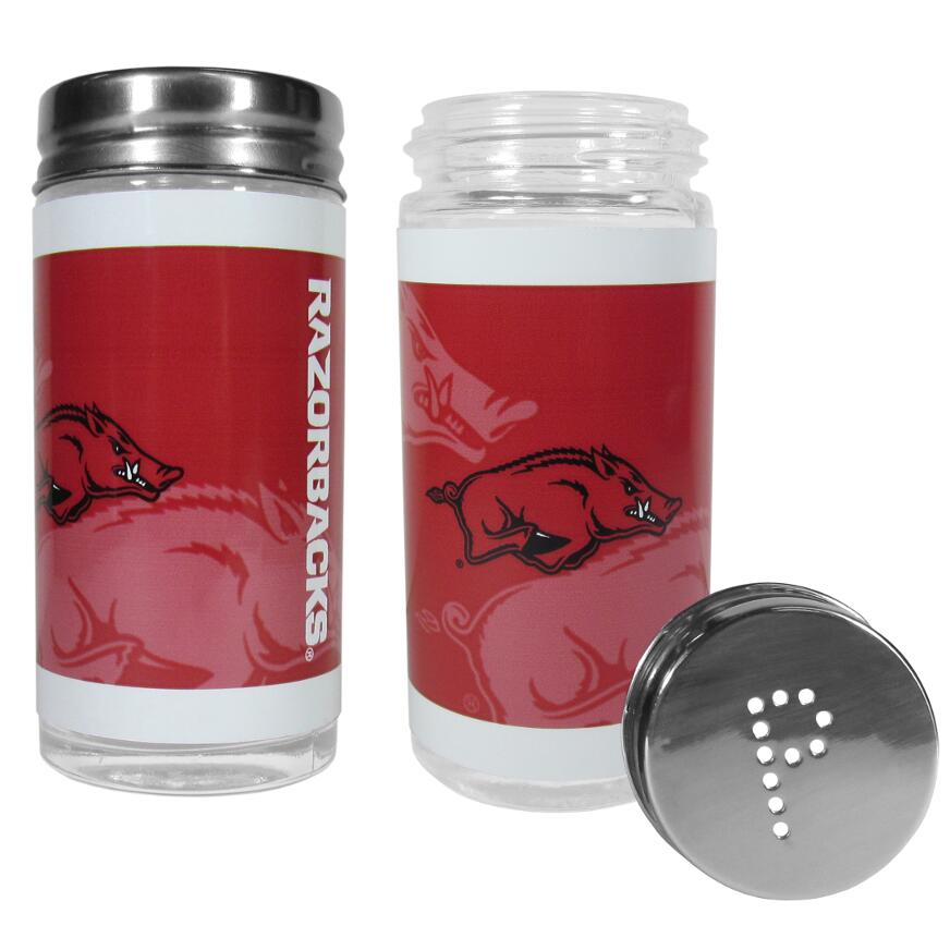 No tailgate party is complete without your Arkansas Razorbacks salt & pepper shakers featuring bright team graphics. The glass shakers are 3.75 inches tall and the screw top lids have holes that spell out P and S. These team shakers are a great grill accessory whether you are barbecuing on the patio, picnicing or having a game day party.
