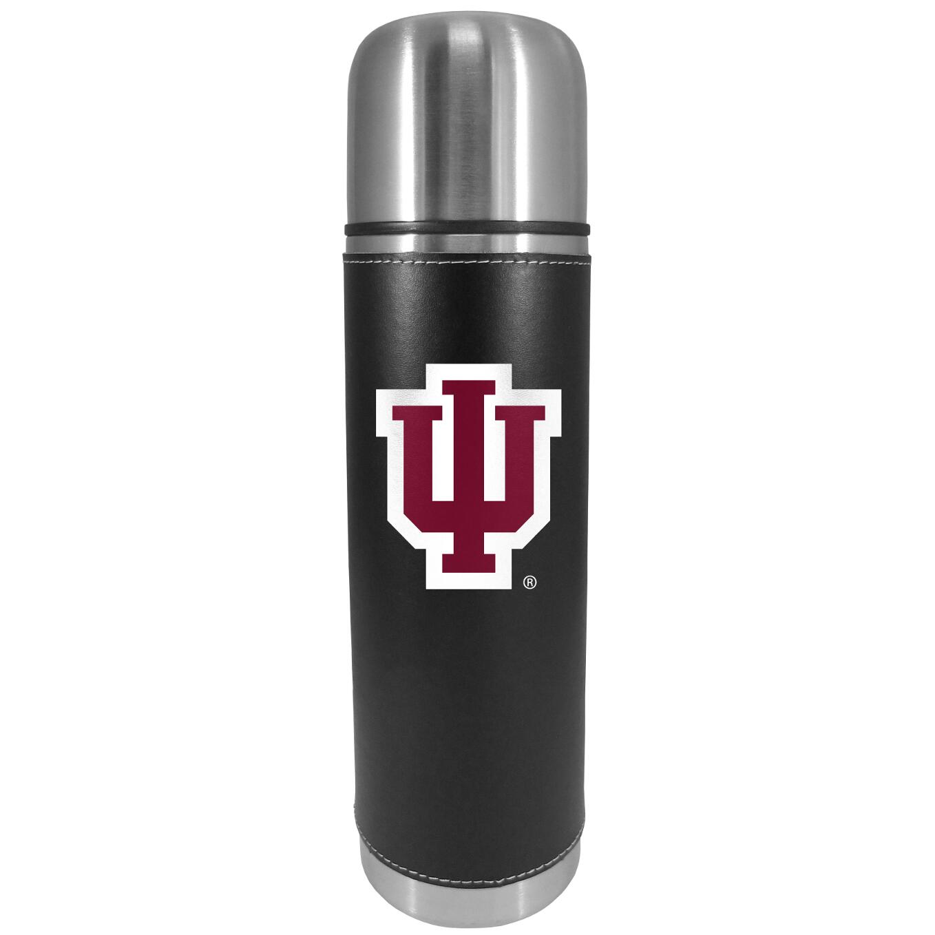 This attractive, 26 ounce Indiana Hoosiers thermos is a great way to keep your beverages hot while on the go. The 11 inch tall, vacuum sealed thermos features a black vinyl wrap with stitched details and a digitally printed team logo. The lid screws on and can be used as a cup.