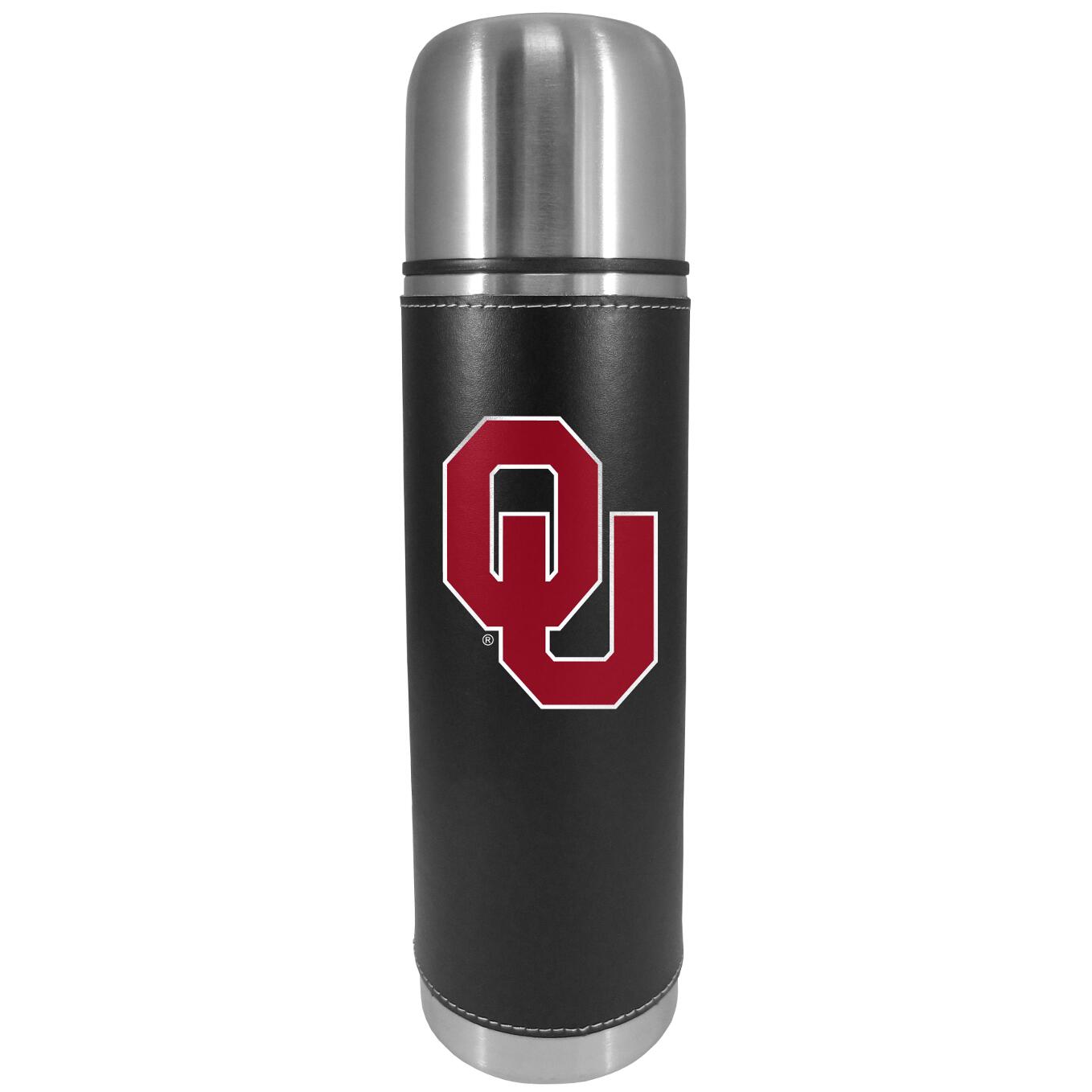 This attractive, 26 ounce Oklahoma Sooners thermos is a great way to keep your beverages hot while on the go. The 11 inch tall, vacuum sealed thermos features a black vinyl wrap with stitched details and a digitally printed team logo. The lid screws on and can be used as a cup.