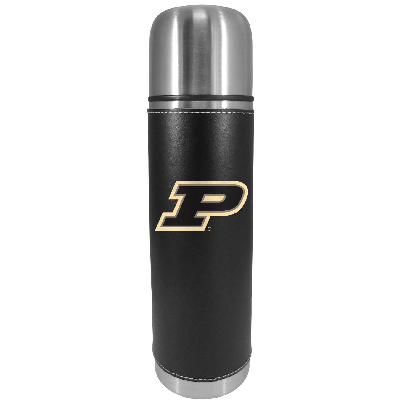 This attractive, 26 ounce Purdue Boilermakers thermos is a great way to keep your beverages hot while on the go. The 11 inch tall, vacuum sealed thermos features a black vinyl wrap with stitched details and a digitally printed team logo. The lid screws on and can be used as a cup.