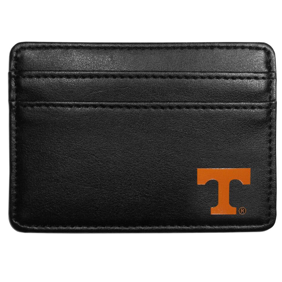 Ditch your bulky wallet! This super slim leather wallet is the perfect weekend companion. The compact design features 2 credit card slots on the front and one on the back and an inner middle pocket for cash. The front of the wallet has a crisp silk screened Tennessee Volunteers logo.