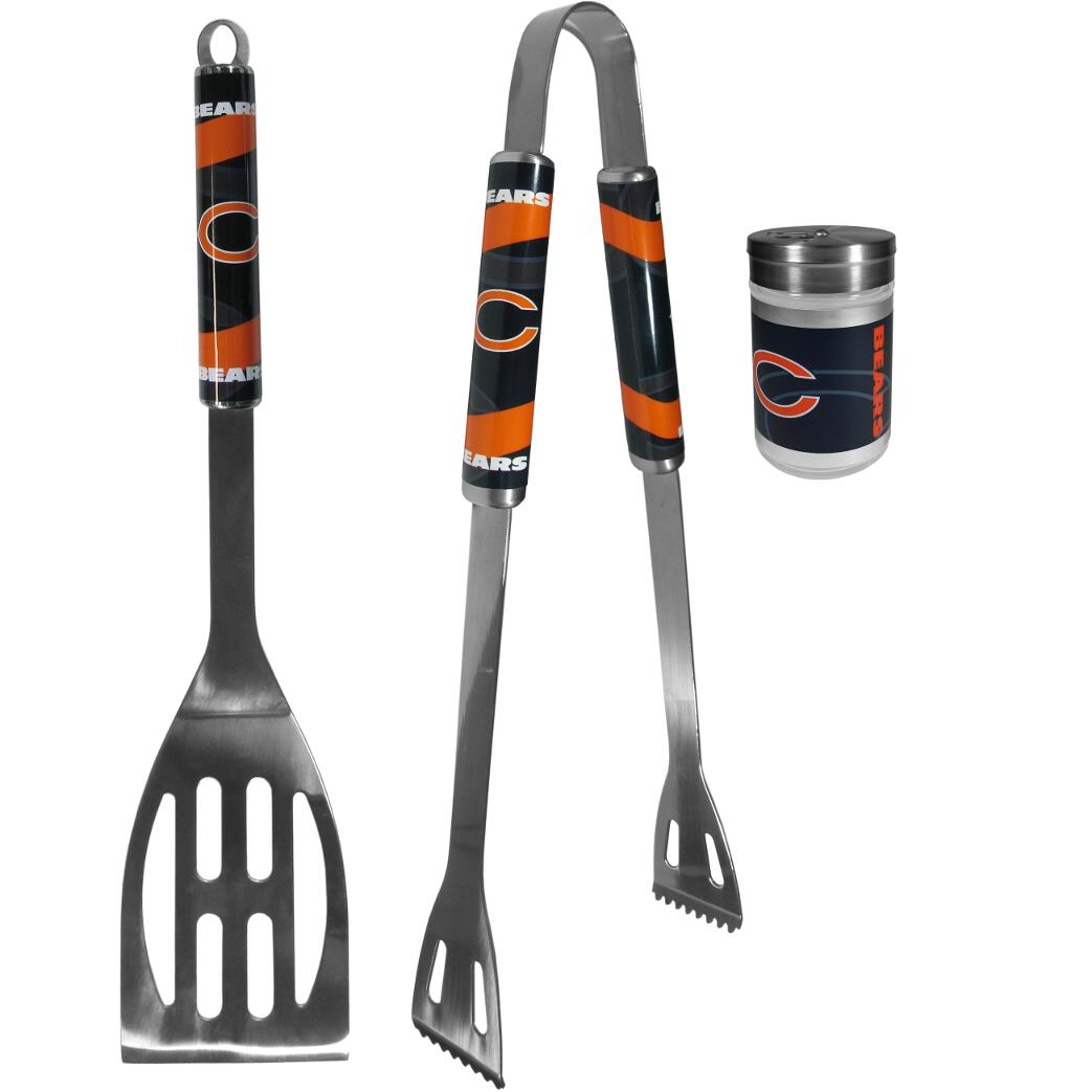 This stainless steel 2pc BBQ grill set is a tailgater's best friend. The colorful and large team graphics on each of the barbecue tools let's everyone know you are a fan! The set in includes a spatula and tongs with the Chicago Bears logo. The tool set comes with a compact shaker is 2 inch tall with a twist top that closes off the holes at the top making it perfect for travel preventing those messy spills. The shaker has wide holes perfect for keeping your pepper seeds or cheese toppings.