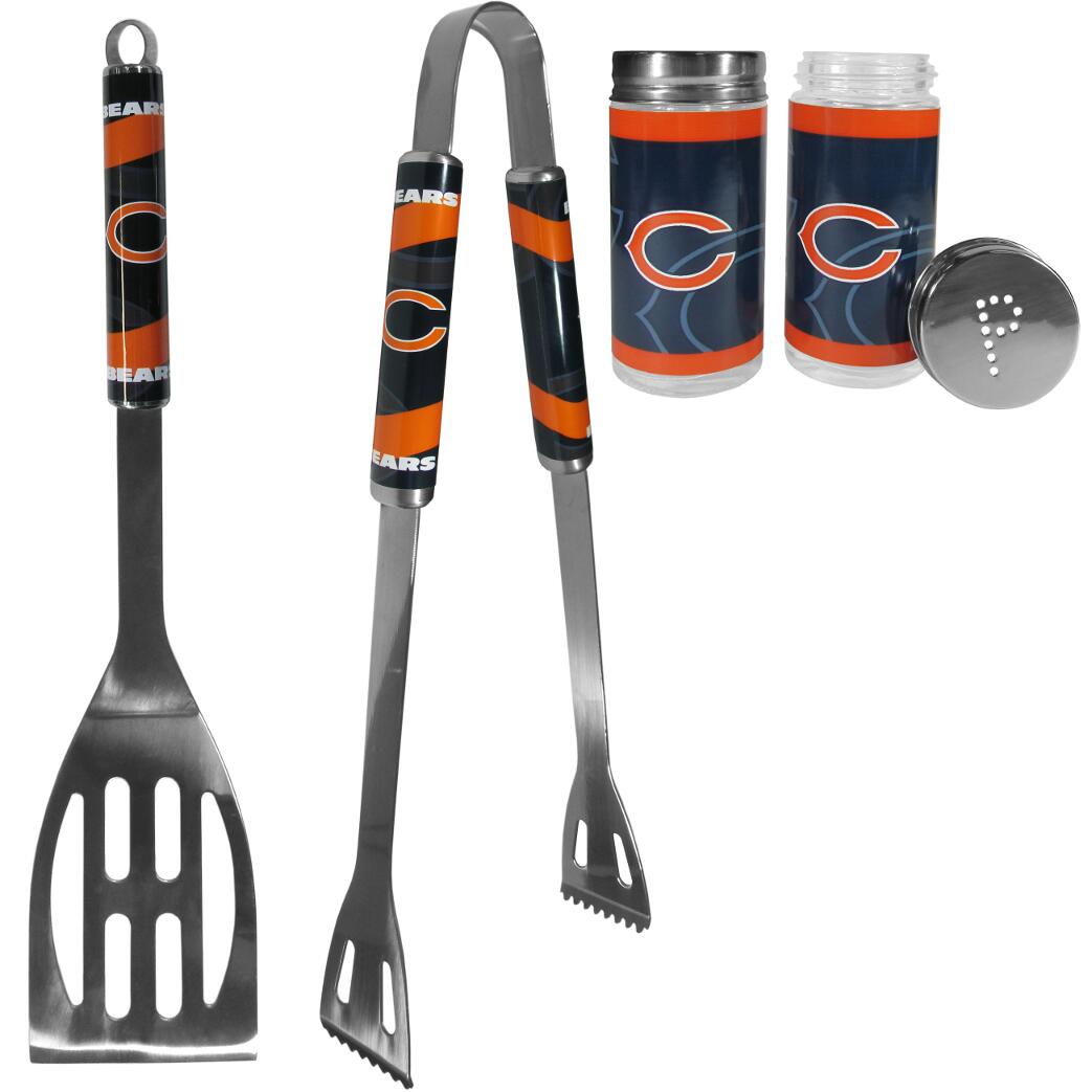 This stainless steel 2pc BBQ grill set is a tailgater's best friend. The colorful and large team graphics on each of the barbecue tools let's everyone know you are a fan! The set in includes a spatula and tongs with the Chicago Bears logo. The tool set come with glass Salt & Pepper Shakers are 3.75 inches tall and the screw top lids have holes that spell out P and S.