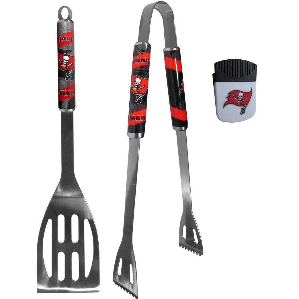 This stainless steel 2 pc BBQ grill set is a tailgater's best friend. The colorful and large team graphics on each of the barbecue tools let's everyone know you are a fan! The set in includes a spatula and tongs with the Tampa Bay Buccaneers proudly display on each tool. Whether you are grilling on your patio or tailgating with your friends this set is a party favorite. The 14 inch length makes these tools easy to pack for camping, travel to the big game or any outdoor event. Comes with an attractive clip magnet to hold memos, photos or appointment cards on the fridge or take it down keep use it to clip bags shut. The chip clip magnet features a large team logo.