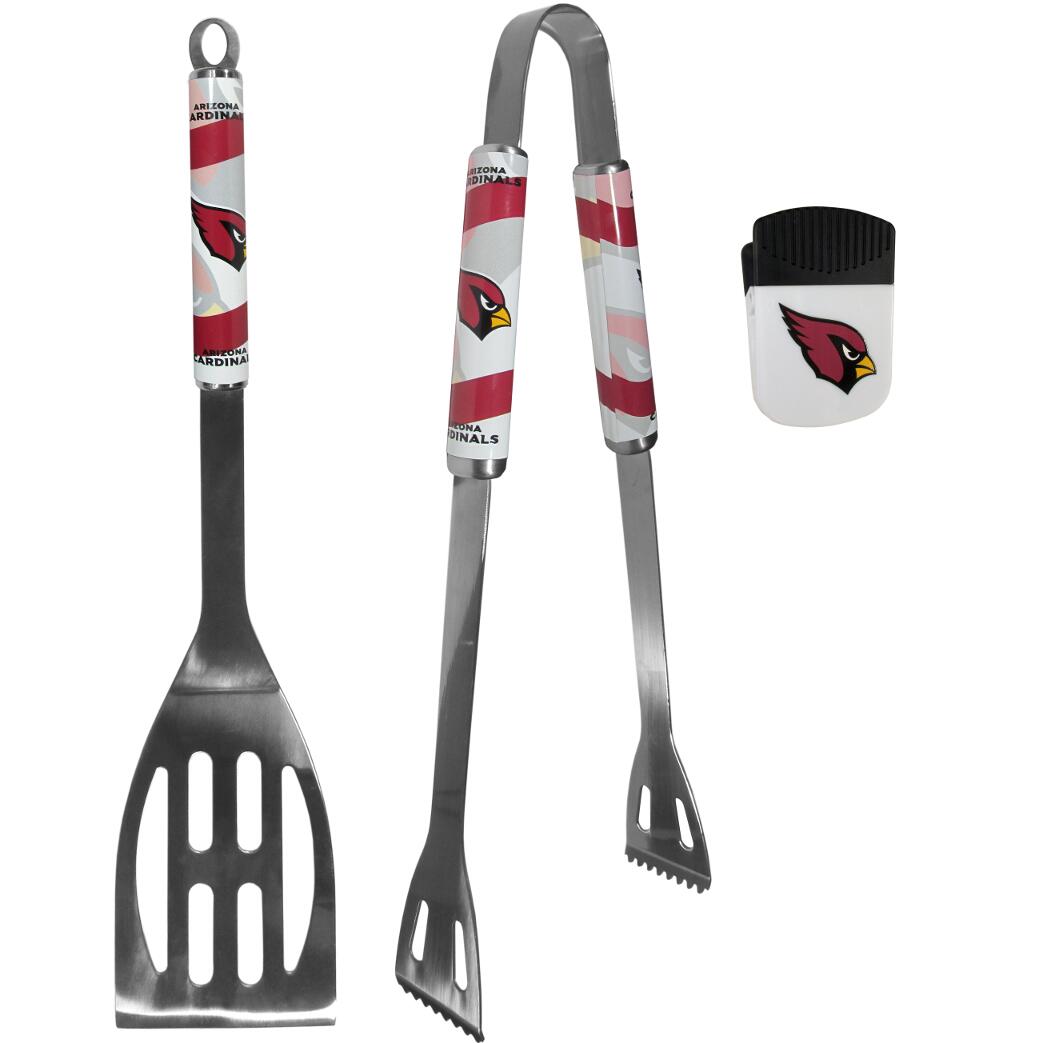 This stainless steel 2 pc BBQ grill set is a tailgater's best friend. The colorful and large team graphics on each of the barbecue tools let's everyone know you are a fan! The set in includes a spatula and tongs with the Arizona Cardinals proudly display on each tool. Whether you are grilling on your patio or tailgating with your friends this set is a party favorite. The 14 inch length makes these tools easy to pack for camping, travel to the big game or any outdoor event. Comes with an attractive clip magnet to hold memos, photos or appointment cards on the fridge or take it down keep use it to clip bags shut. The chip clip magnet features a large team logo.