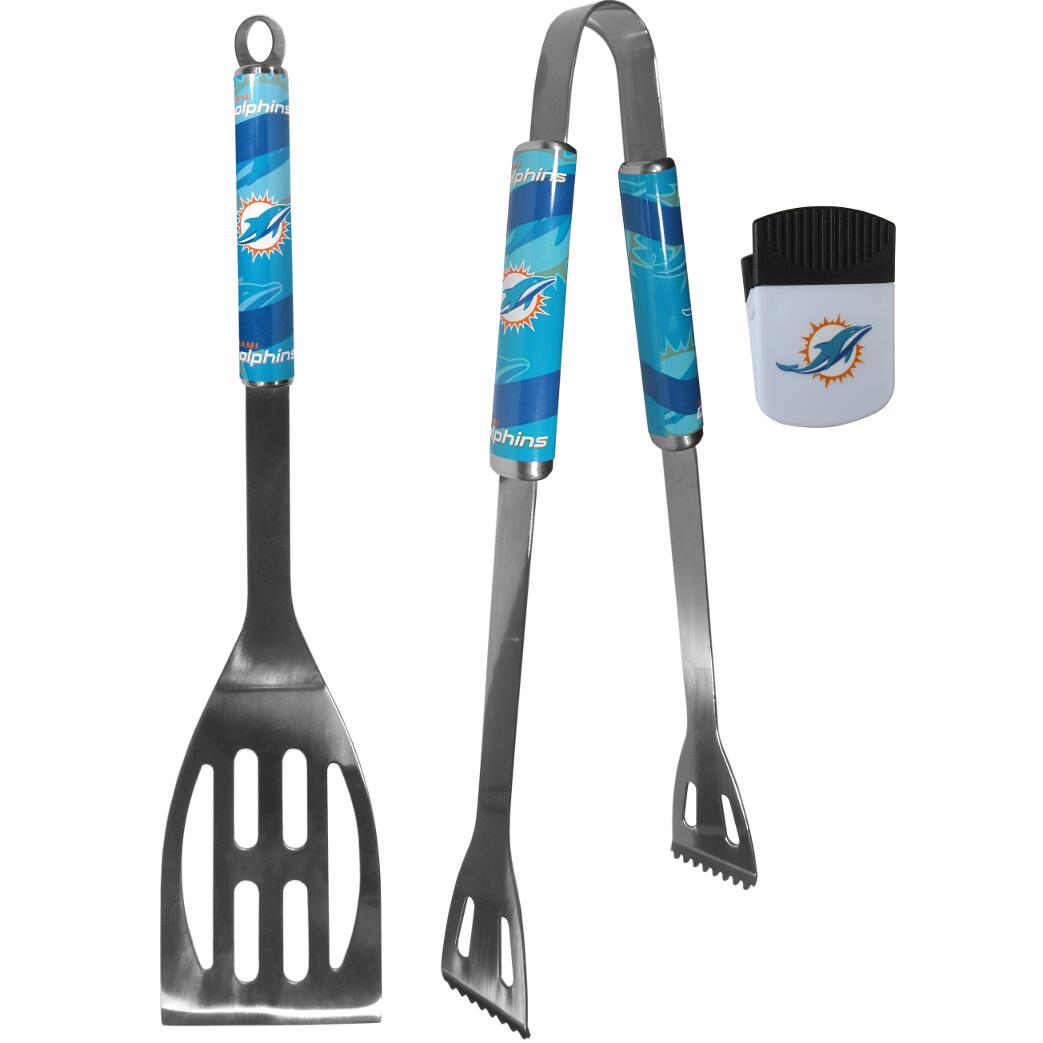 This stainless steel 2 pc BBQ grill set is a tailgater's best friend. The colorful and large team graphics on each of the barbecue tools let's everyone know you are a fan! The set in includes a spatula and tongs with the Miami Dolphins proudly display on each tool. Whether you are grilling on your patio or tailgating with your friends this set is a party favorite. The 14 inch length makes these tools easy to pack for camping, travel to the big game or any outdoor event. Comes with an attractive clip magnet to hold memos, photos or appointment cards on the fridge or take it down keep use it to clip bags shut. The chip clip magnet features a large team logo.