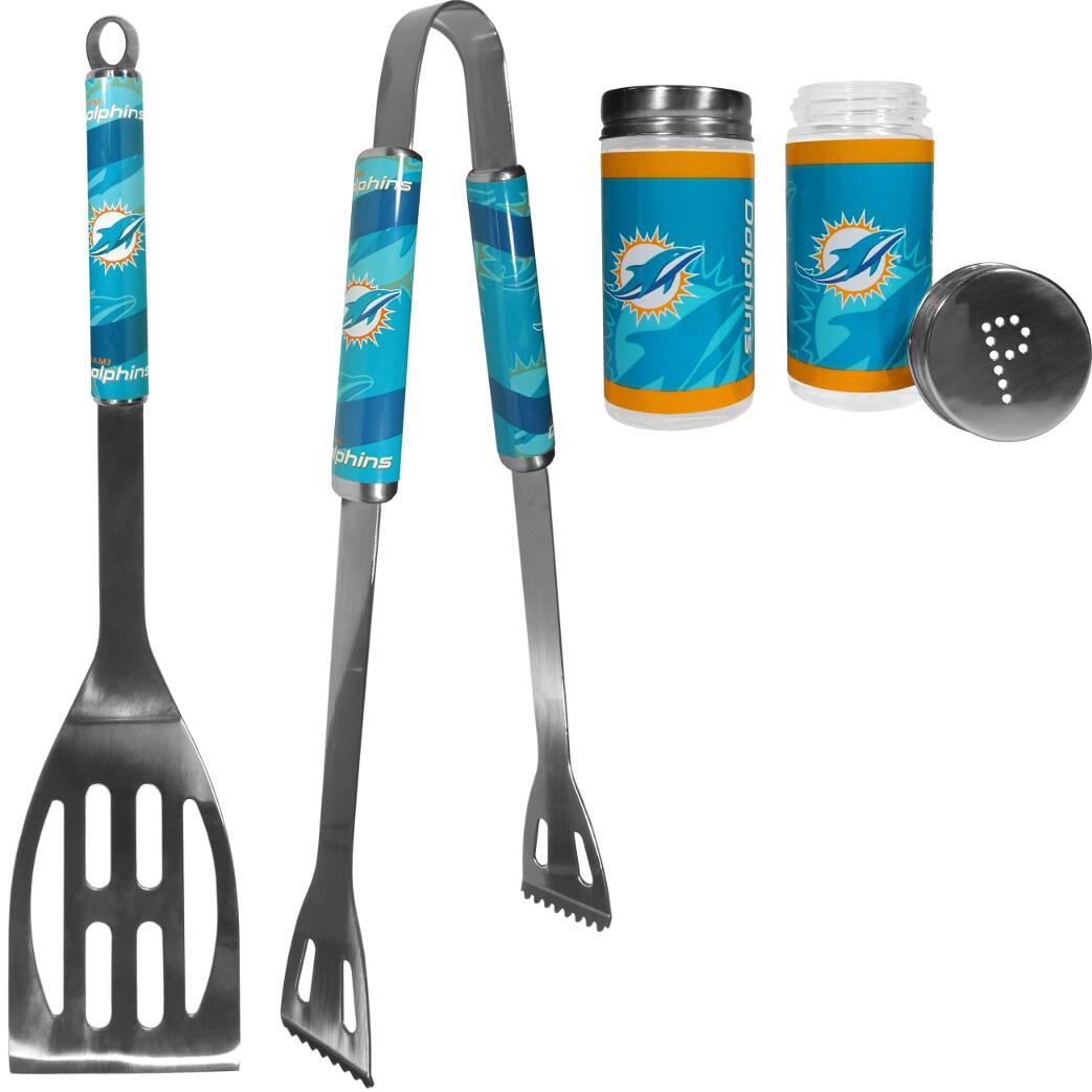 This stainless steel 2pc BBQ grill set is a tailgater's best friend. The colorful and large team graphics on each of the barbecue tools let's everyone know you are a fan! The set in includes a spatula and tongs with the Miami Dolphins logo. The tool set come with glass Salt & Pepper Shakers are 3.75 inches tall and the screw top lids have holes that spell out P and S.
