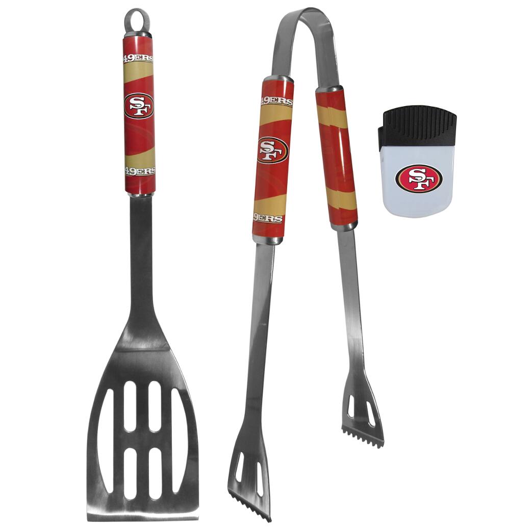 This stainless steel 2 pc BBQ grill set is a tailgater's best friend. The colorful and large team graphics on each of the barbecue tools let's everyone know you are a fan! The set in includes a spatula and tongs with the San Francisco 49ers proudly display on each tool. Whether you are grilling on your patio or tailgating with your friends this set is a party favorite. The 14 inch length makes these tools easy to pack for camping, travel to the big game or any outdoor event. Comes with an attractive clip magnet to hold memos, photos or appointment cards on the fridge or take it down keep use it to clip bags shut. The chip clip magnet features a large team logo.