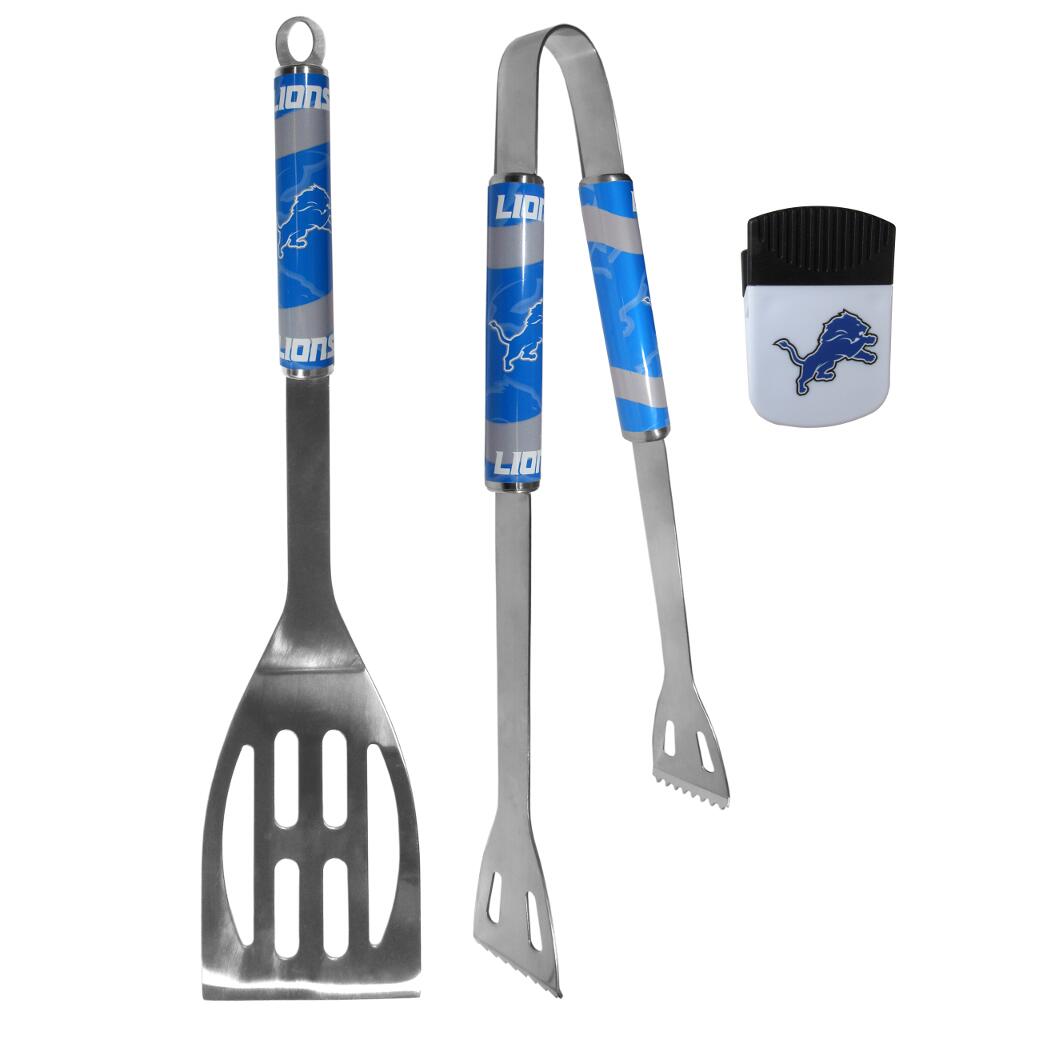 This stainless steel 2 pc BBQ grill set is a tailgater's best friend. The colorful and large team graphics on each of the barbecue tools let's everyone know you are a fan! The set in includes a spatula and tongs with the Detroit Lions proudly display on each tool. Whether you are grilling on your patio or tailgating with your friends this set is a party favorite. The 14 inch length makes these tools easy to pack for camping, travel to the big game or any outdoor event. Comes with an attractive clip magnet to hold memos, photos or appointment cards on the fridge or take it down keep use it to clip bags shut. The chip clip magnet features a large team logo.