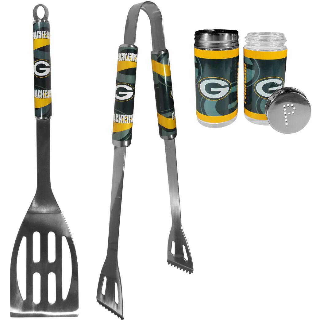 This stainless steel 2pc BBQ grill set is a tailgater's best friend. The colorful and large team graphics on each of the barbecue tools let's everyone know you are a fan! The set in includes a spatula and tongs with the Green Bay Packers logo. The tool set come with glass Salt & Pepper Shakers are 3.75 inches tall and the screw top lids have holes that spell out P and S.