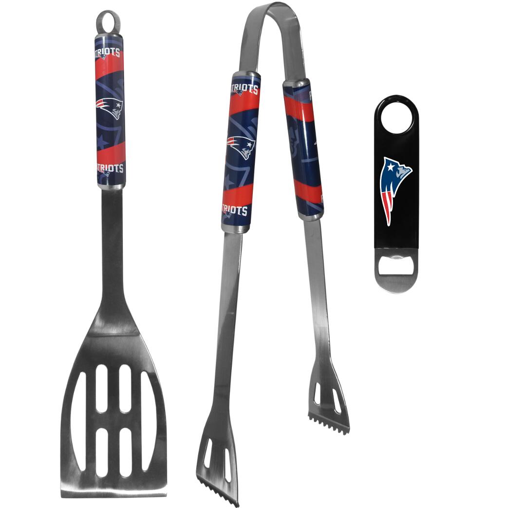 This stainless steel 2 pc BBQ grill set is a tailgater's best friend. The colorful and large team graphics on each of the barbecue tools let's everyone know you are a fan! The set in includes a spatula and tongs with the New England Patriots proudly display on each tool. Whether you are grilling on your patio or tailgating with your friends this set is a party favorite. The 14 inch length makes these tools easy to pack for camping, travel to the big game or any outdoor event. Comes with a heavy-duty steel opener that is extra long, with a durable vinyl covering. The extra length provides more leverage for speed opening and the opener features a large printed team logo.