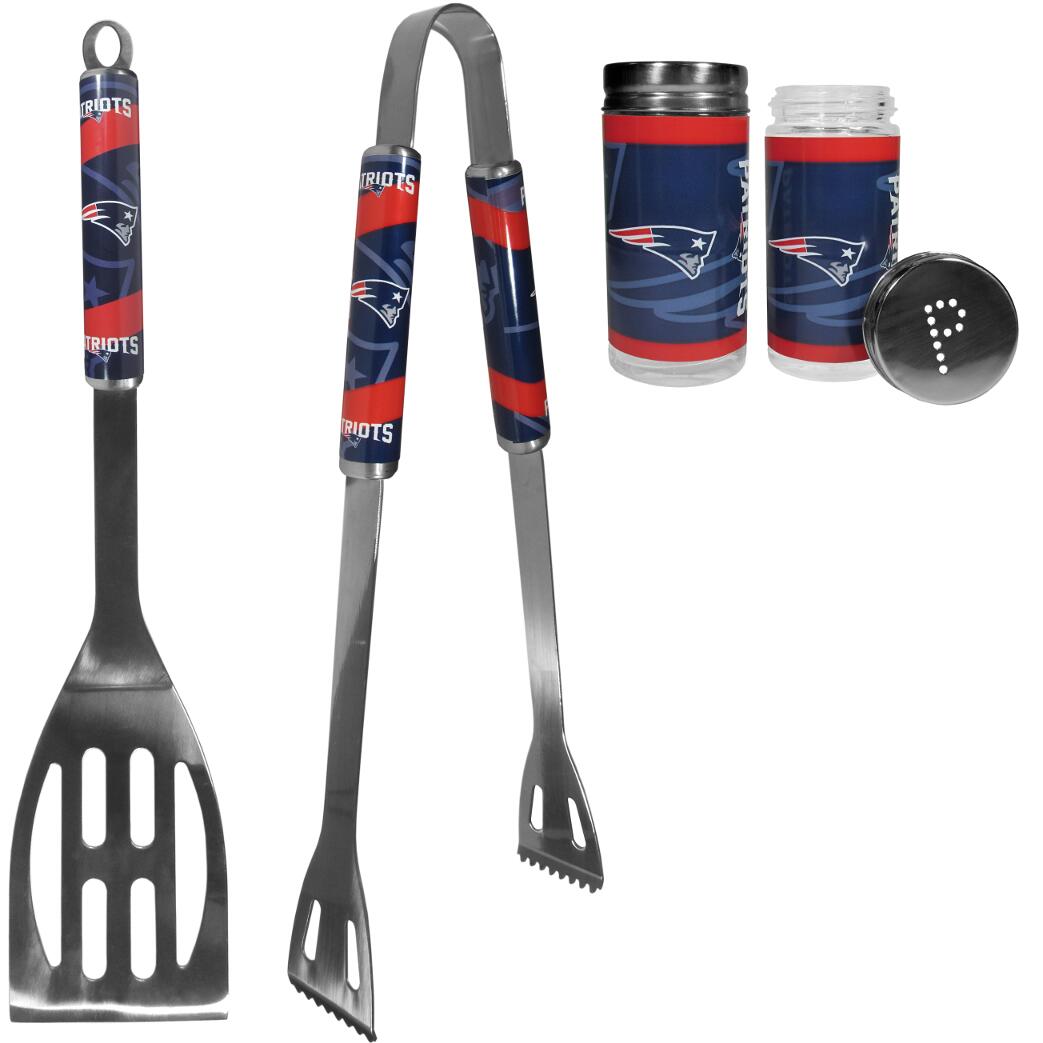 This stainless steel 2pc BBQ grill set is a tailgater's best friend. The colorful and large team graphics on each of the barbecue tools let's everyone know you are a fan! The set in includes a spatula and tongs with the New England Patriots logo. The tool set come with glass Salt & Pepper Shakers are 3.75 inches tall and the screw top lids have holes that spell out P and S.