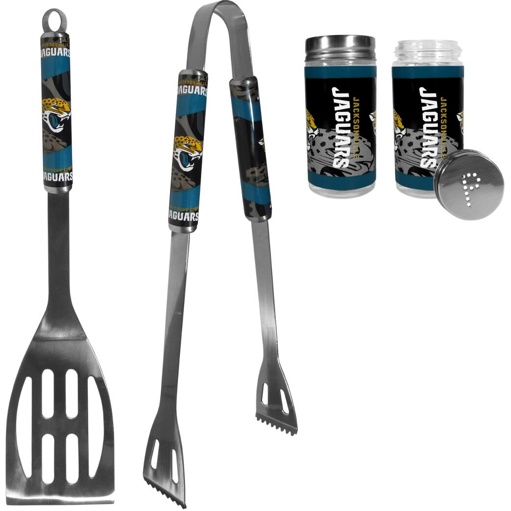 This stainless steel 2pc BBQ grill set is a tailgater's best friend. The colorful and large team graphics on each of the barbecue tools let's everyone know you are a fan! The set in includes a spatula and tongs with the Jacksonville Jaguars logo. The tool set come with glass Salt & Pepper Shakers are 3.75 inches tall and the screw top lids have holes that spell out P and S.
