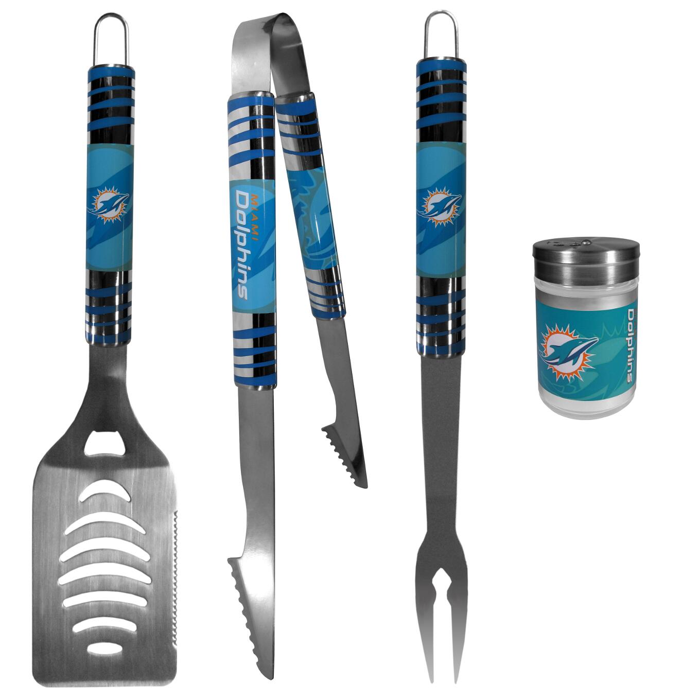 The eye-catching chrome graphics on this set make it a game day favorite! The high-quality, 420 grade stainless steel 3 pc Miami Dolphins BBQ grill set will make any grill master smile. These barbeque tools are made to last and the tool set includes a large spatula with a bottle opener feature and sharp serrated edge, strong tongs and fork. The 16 inch length keeps you far from the flames. Paired with our tailgater season shakers and you’re ready for any game day event! This compact shaker is 2 inch tall with a twist top that closes off the holes at the top making it perfect for travel preventing those messy spills. The shaker has wide holes perfect for keeping your pepper seeds or cheese toppings.