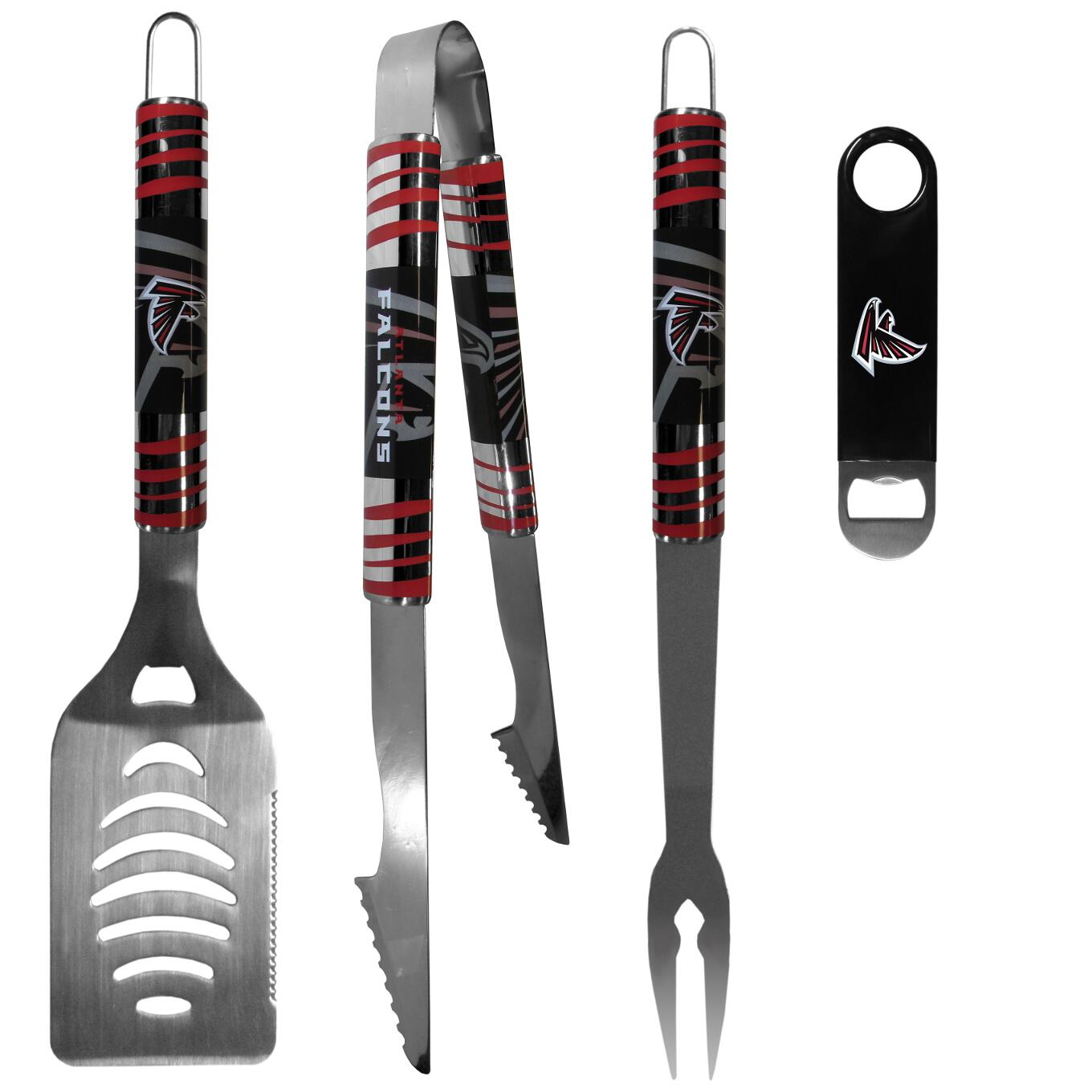 The high-quality, 420 grade stainless steel 3 pc Atlanta Falcons BBQ grill set will make any grill master smile. The set includes a large spatula with a bottle opener feature and sharp serrated edge, strong tongs and fork. The 16 inch length keeps you far from the flames. Comes with a heavy-duty steel opener that is extra long, with a durable vinyl covering. The extra length provides more leverage for speed opening and the opener features a large printed team logo.