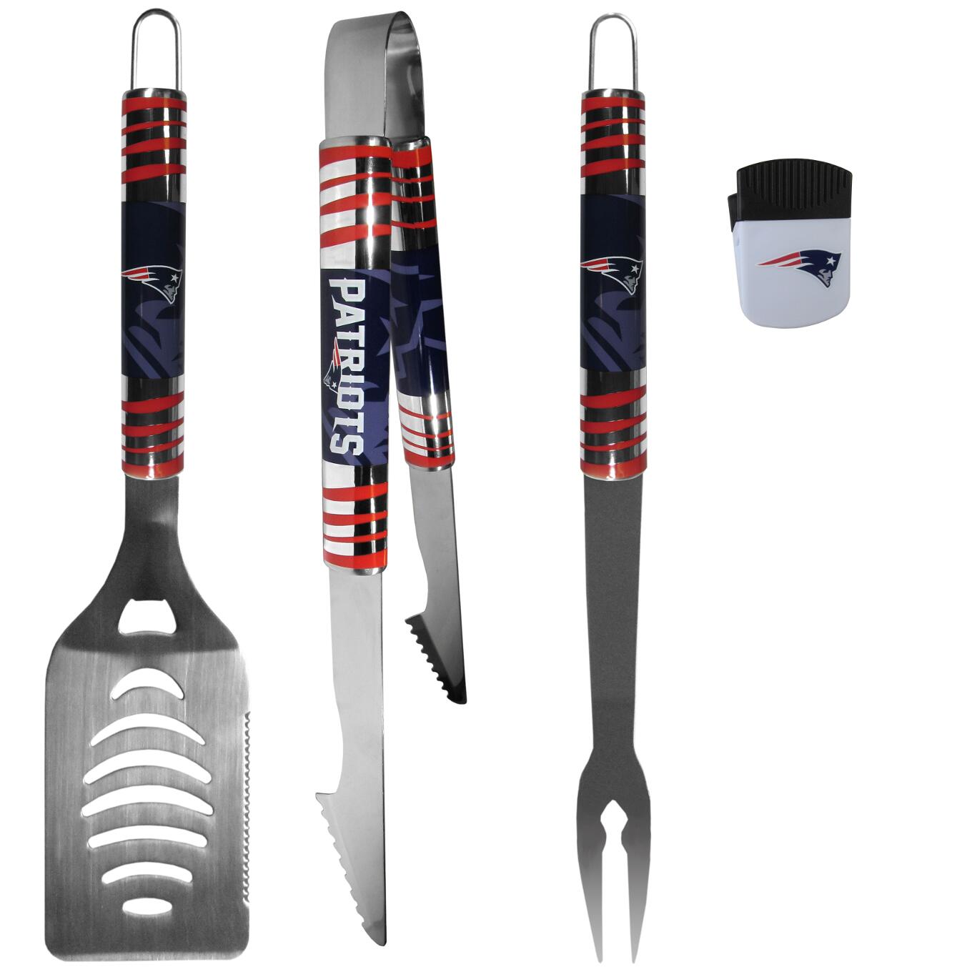 The high-quality, 420 grade stainless steel 3 pc New England Patriots BBQ grill set will make any grill master smile. The set includes a large spatula with a bottle opener feature and sharp serrated edge, strong tongs and fork. The 16 inch length keeps you far from the flames. Comes with an attractive clip magnet to hold memos, photos or appointment cards on the fridge or take it down keep use it to clip bags shut. The chip clip magnet features a large team logo.