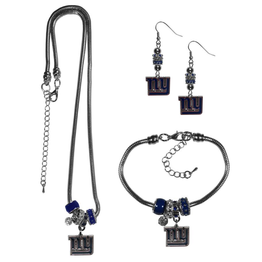 This must-have New York Giants look features the wildly popular euro bead style teamed with eye catching team charms. The 18 inch, snake chain necklace is paired with delicate matching earrings with hypoallergenic, steel fishhook posts and matching bracelet.
