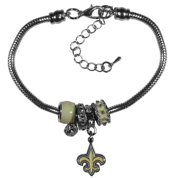 We have combined the wildly popular Euro style beads with your favorite team to create our New Orleans Saints bead bracelet. The 7.5 inch snake chain with 2 inch extender features 4 Euro beads with enameled team colors and rhinestone accents with a high polish, nickel free charm and rhinestone charm. Perfect way to show off your team pride.