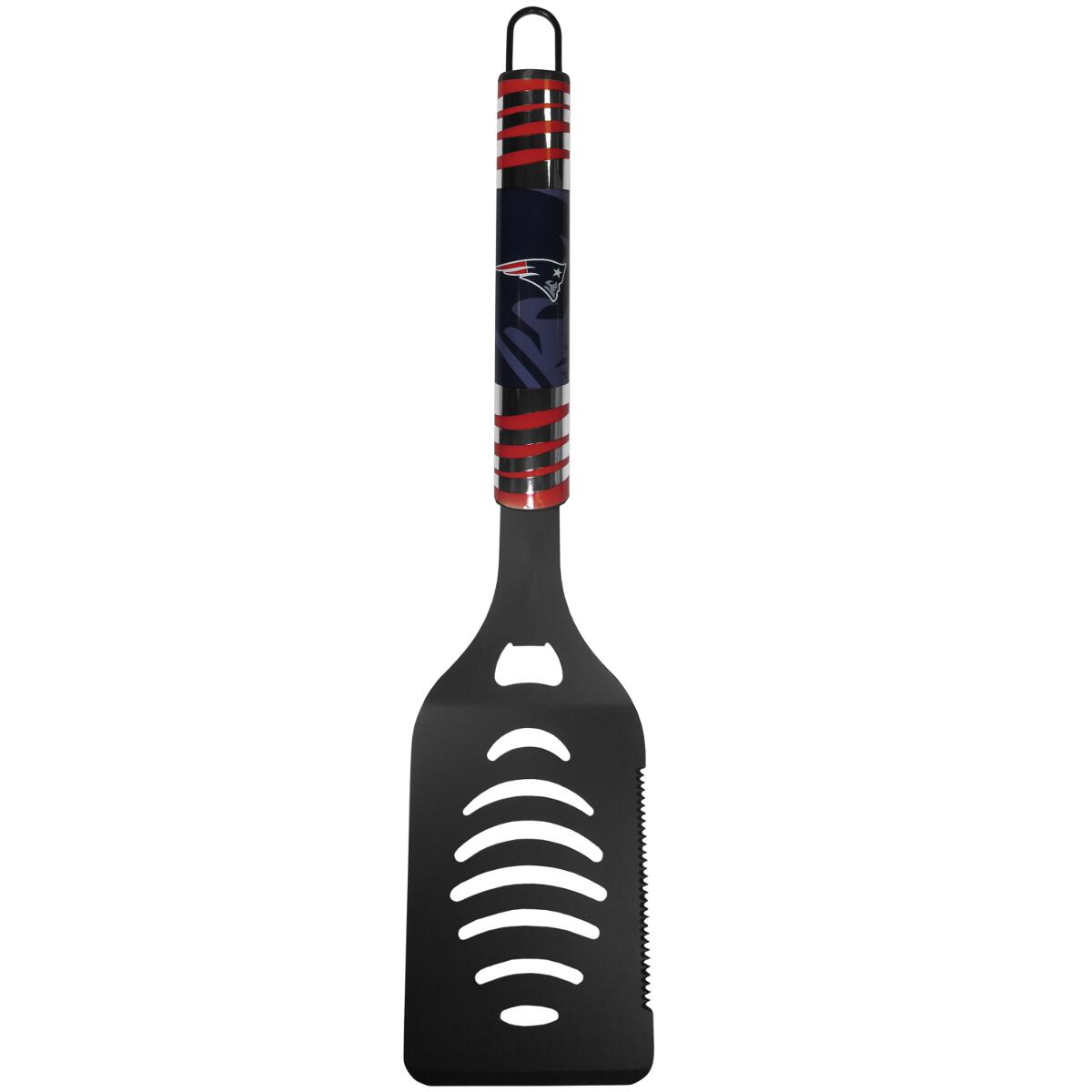 Our tailgater spatula really catches your eye with team color and chrome accents and New England Patriots digital graphics. The 440 grade stainless steel spatula is a tough, heavy-duty tool that will last through years of tailgating fun. The spatula features a bottle opener and sharp serrated edge and comes with a matte black finish.