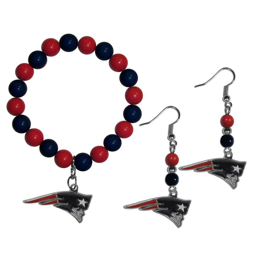 This fun and colorful New England Patriots fan bead jewelry set is fun and casual with eye-catching beads in bright team colors. The fashionable dangle earrings feature a team colored beads that drop down to a carved and enameled charm. The stretch bracelet has larger matching beads that make a striking statement and have a matching team charm. These sassy yet sporty jewelry pieces make a perfect gift for any female fan. Spice up your game-day outfit with these fun colorful earrings and bracelet that are also cute enough for any day.