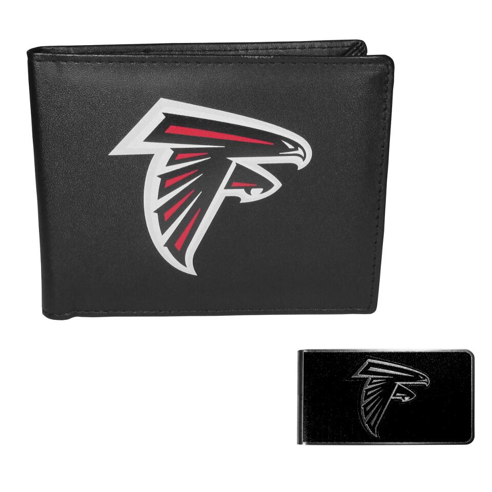 Sports fans do not have to sacrifice style with this classic bi-fold wallet that sports the Atlanta Falcons extra large logo. This men's fashion accessory has a leather grain look and expert craftmanship for a quality wallet at a great price. The wallet features inner credit card slots, windowed ID slot and a large billfold pocket. The wallet comes with separate steel money clip with a classic black & metal finish.