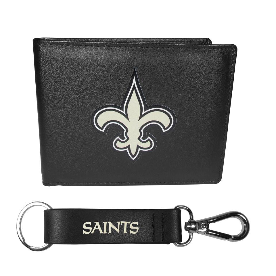 Sports fans do not have to sacrifice style with this classic bi-fold wallet that sports the New Orleans Saints extra large logo. This men's fashion accessory has a leather grain look and expert craftmanship for a quality wallet at a great price. The wallet features inner credit card slots, windowed ID slot and a large billfold pocket. Comes with a stylish black strap key chain with clip to easily attach to belts, backpacks or purses.