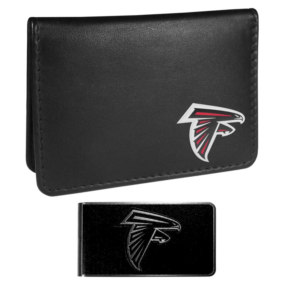 This unique mini wallet has all the benefits of a weekend wallet with the added security of a traditional bi-fold. Unlike other weekend wallets that can become stretched and allow your credit cards to slip free this wallet flips over to close and make sure your cash and cards remove safely inside the wallet. The classic black wallet features a Atlanta Falcons logo expertly printed on the front corner. Comes with separate steel money clip with a classic black & metal finish.