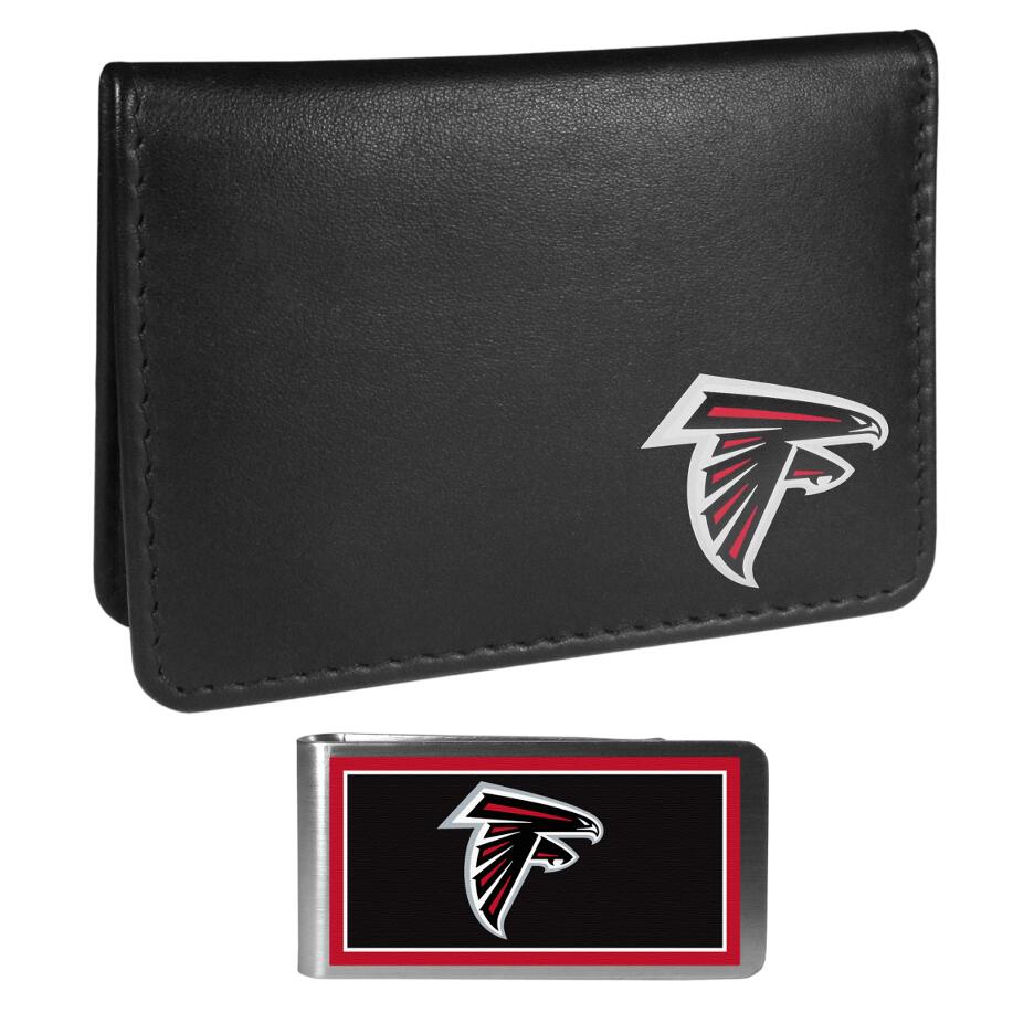This unique mini wallet has all the benefits of a weekend wallet with the added security of a traditional bi-fold. Unlike other weekend wallets that can become stretched and allow your credit cards to slip free this wallet flips over to close and make sure your cash and cards remove safely inside the wallet. The classic black wallet features a Atlanta Falcons logo expertly printed on the front corner. Comes with separate steel money clip with a full color team design.