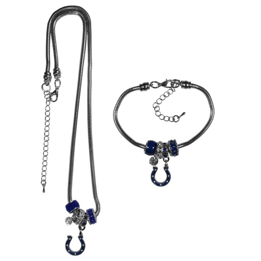 This must-have Indianapolis Colts look features the wildly popular euro bead style teamed with eye catching team charms. This set comes with a fashionable snake chain bracelet and 18 inch necklace both featuring a variety of team colored euro beads and rhinestone beads for classy look that outshines the average fan jewelry. This high quality set is great for game-day but a fan's going to want to show off this set everyday!