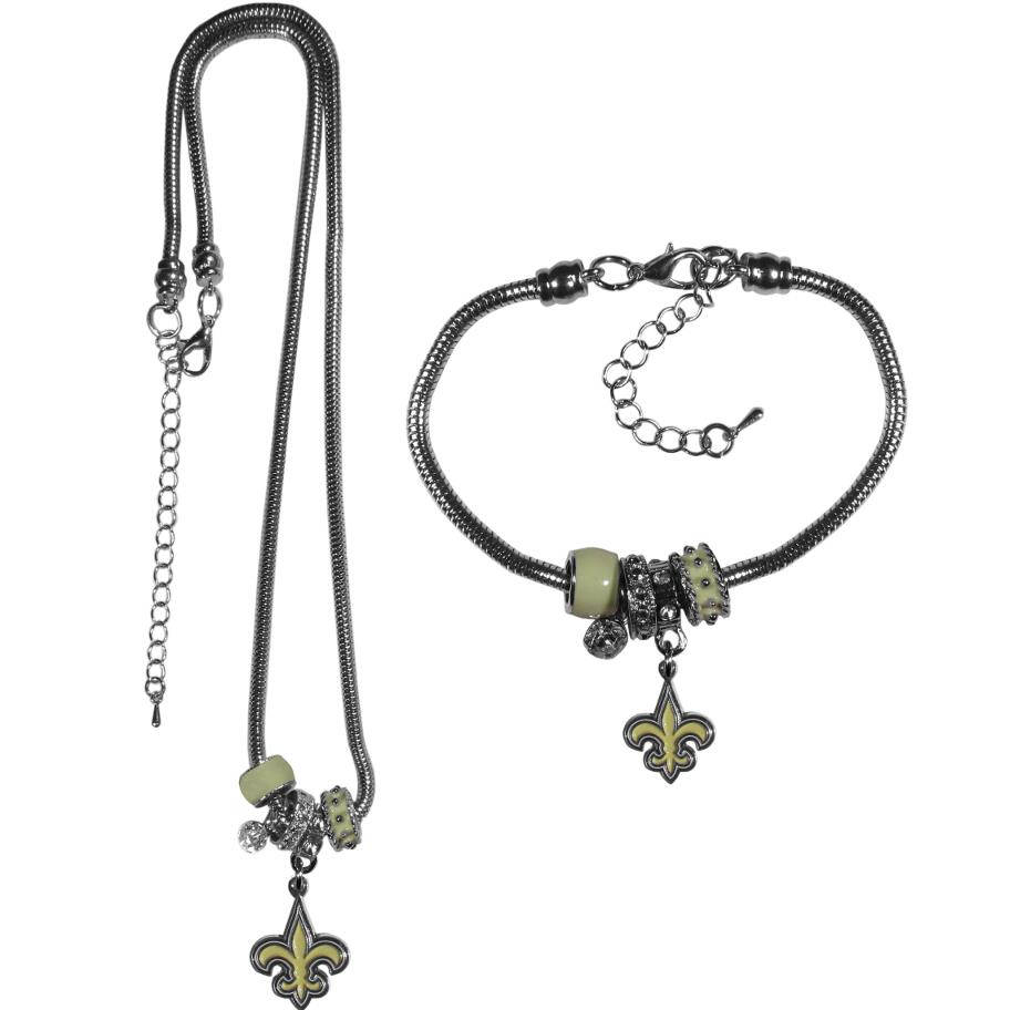 This must-have New Orleans Saints look features the wildly popular euro bead style teamed with eye catching team charms. This set comes with a fashionable snake chain bracelet and 18 inch necklace both featuring a variety of team colored euro beads and rhinestone beads for classy look that outshines the average fan jewelry. This high quality set is great for game-day but a fan's going to want to show off this set everyday!