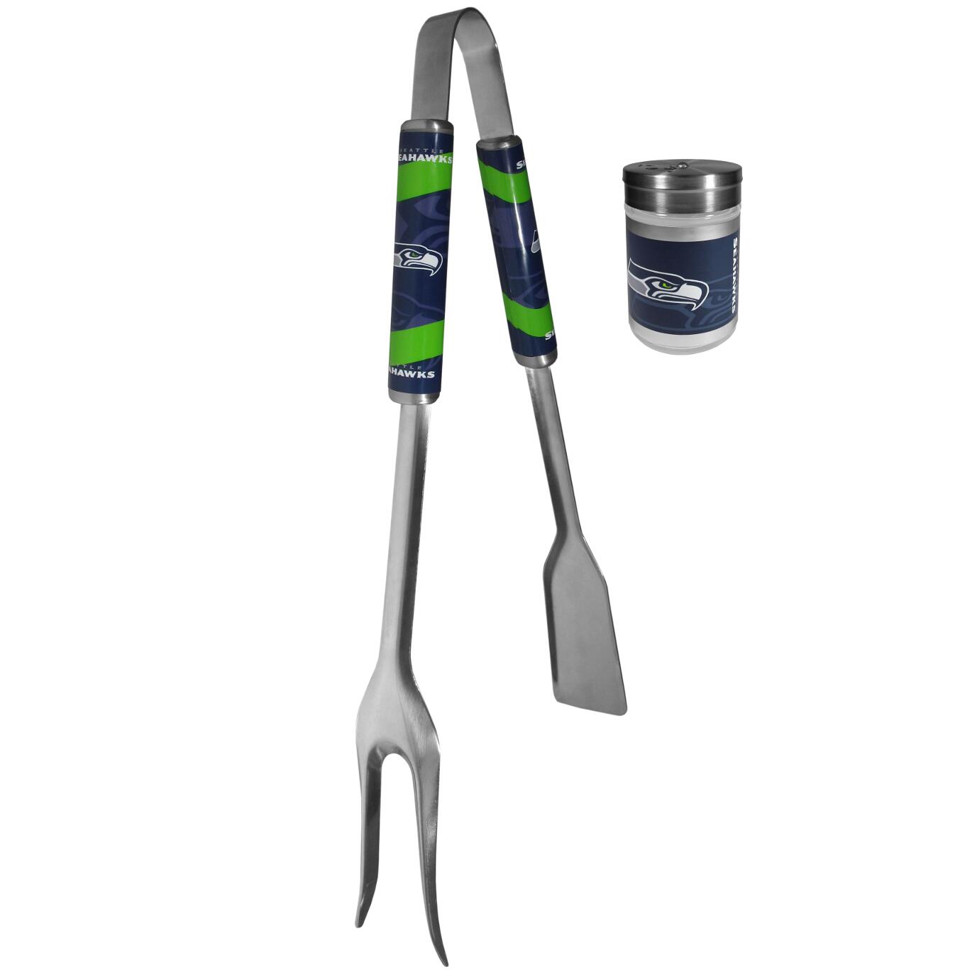 The perfect space saving tool! This stainless steel grilling tool is a spatula, tongs and fork all in one high-quality BBQ tool. The tool features bright Seattle Seahawks graphics. Comes with a compact shaker that is 2 inches tall with a twist top that closes off the holes at the top making it perfect for travel preventing those messy spills. The shaker has wide holes perfect for keeping your pepper seeds or cheese toppings.