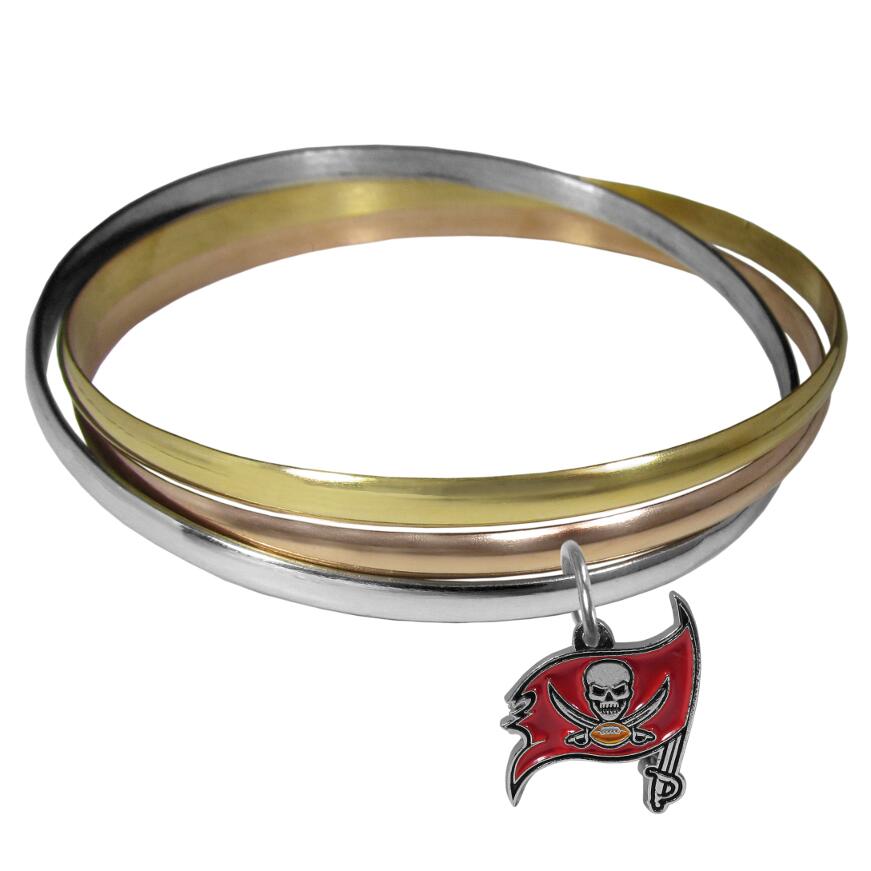 These beautiful bangles come in a interlocking style and feature a fully cast Tampa Bay Buccaneers charm with enameled team colors. The bracelet has a silver toned bangle, gold tone bangle and brass toned bangle.