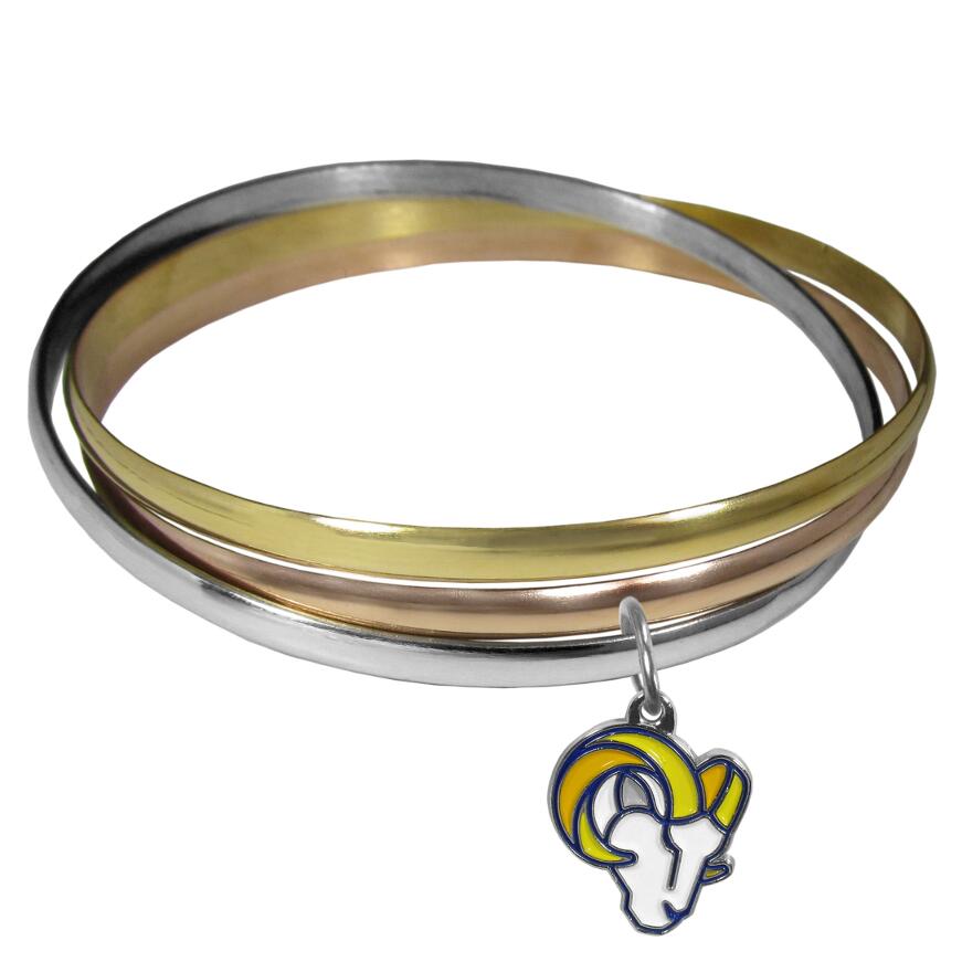 These beautiful bangles come in a interlocking style and feature a fully cast Los Angeles Rams charm with enameled team colors. The bracelet has a silver toned bangle, gold tone bangle and brass toned bangle.
