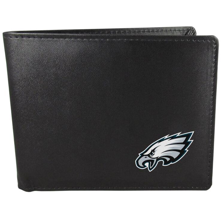 Sports fans do not have to sacrifice style with this classic bi-fold wallet that sports a Philadelphia Eagles emblem. This men's fashion accessory has a leather grain look and expert craftmanship for a quality wallet at a great price. The wallet features inner credit card slots, windowed ID slot and a large billfold pocket. The front of the wallet features a printed team logo.