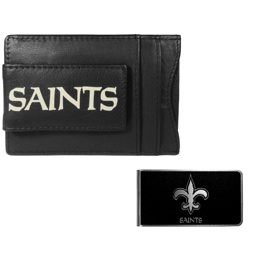 This super slim leather wallet lets you have all the benefits of a money clip while keeping the organization of a wallet. On one side of this front pocket wallet there is a strong, magnetic money clip to keep your cash easily accessible and the New Orleans Saints team logo on the front. The wallet comes with a steel money clip with a black team design.