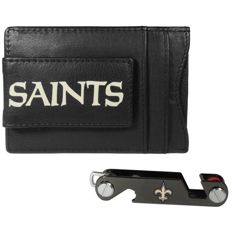 This super slim leather wallet lets you have all the benefits of a money clip while keeping the organization of a wallet. On one side of this front pocket wallet there is a strong, magnetic money clip to keep your cash easily accessible and the New Orleans Saints team logo on the front. Comes with our innovative key organizer that stores your keys in a compact, easy to access bundle with Swiss style engineering. You can load up to 10 keys that zipper back into the organizer so that you never have to deal with keys poking you in your pocket, damaging your purse or simply creating a ton of noise. There is a handy loop piece to attach your larger car key or fob.