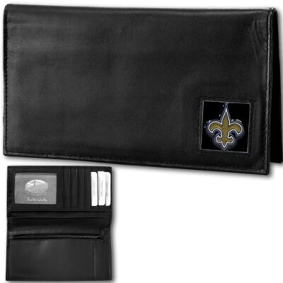 Our officially licensed checkbook cover is made of high quality leather and includes a card holder, clear ID window, and inside zipper pocket for added storage. Fully cast and enameled New Orleans Saints team emblem on the front of the wallet.