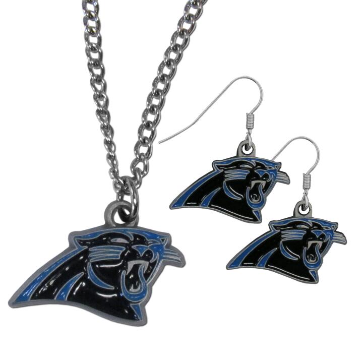 This classic jewelry set contains are most popular Carolina Panthers dangle earrings and 22 inch chain necklace. The trendy, dangle earrings are lightweight and feature a fully cast metal team charm with enameled team colors. The matching necklace completes this fashion forward combo and is a spirited set that is perfect for game day but nice enough for everyday.
