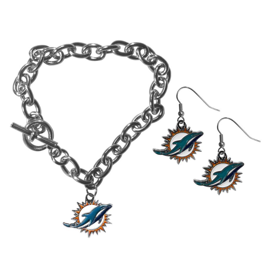 This Miami Dolphins jewelry set comes with lightweight dangle earrings and a toggle chain bracelet. This sporty combo is the perfect fashion accessory for a fan looking for a fashionable way to show off her team pride.