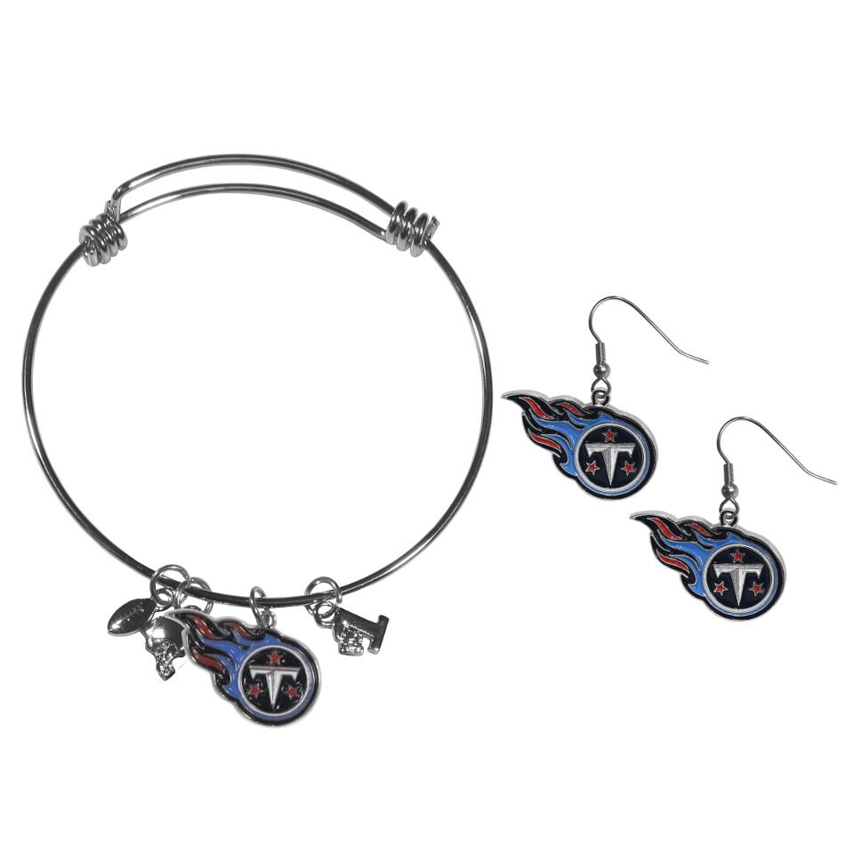 Our trendy Tennessee Titans charm bangle bracelet is now paired with our most popular dangle earrings for the perfect finish to any fan's outfit. The ajustable wire bracelet with 3 football themed charms and a beautiful team charm that matches the team charm on the earrings. The earrings have hypoallergenic, steel fishhook posts.