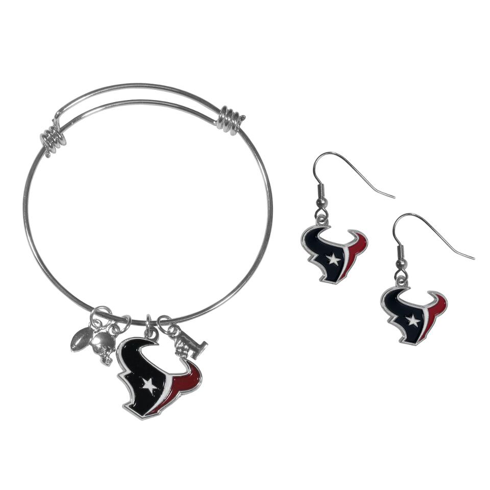 Our trendy Houston Texans charm bangle bracelet is now paired with our most popular dangle earrings for the perfect finish to any fan's outfit. The ajustable wire bracelet with 3 football themed charms and a beautiful team charm that matches the team charm on the earrings. The earrings have hypoallergenic, steel fishhook posts.