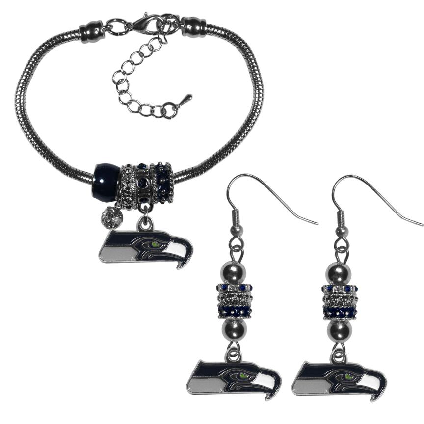 We combine the popular Euro bead style with your love of the Seattle Seahawks with this beautiful jewelry set that includes earrings and a matching bracelet. The stylish earrings feature hypoallergenic, nickel free fishhook posts and 3 team colored Euro beads and a metal team charm. The matching snake chain bracelet is 7.5 inches long with a 2 inch extender and 4 Euro beads with a rhinestone charm and team charm.