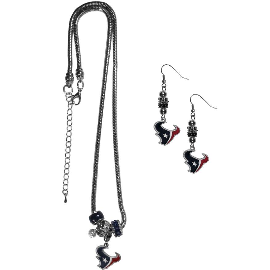 This must-have Houston Texans look features the wildly popular euro bead style teamed with eye catching team charms. The 18 inch, snake chain necklace is paired with delicate matching earrings with hypoallergenic, steel fishhook posts.