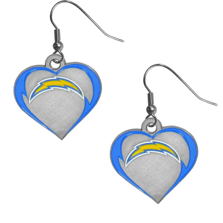 These bold heart earrings have 1 1/8 inch heart charms on hypoallergenic fishhook posts. The charms feature a fully cast Los Angeles Chargers logo with expertly enameled detail and a beautiful enameled swirl finish. A perfect addition to any fan's jewelry collection.