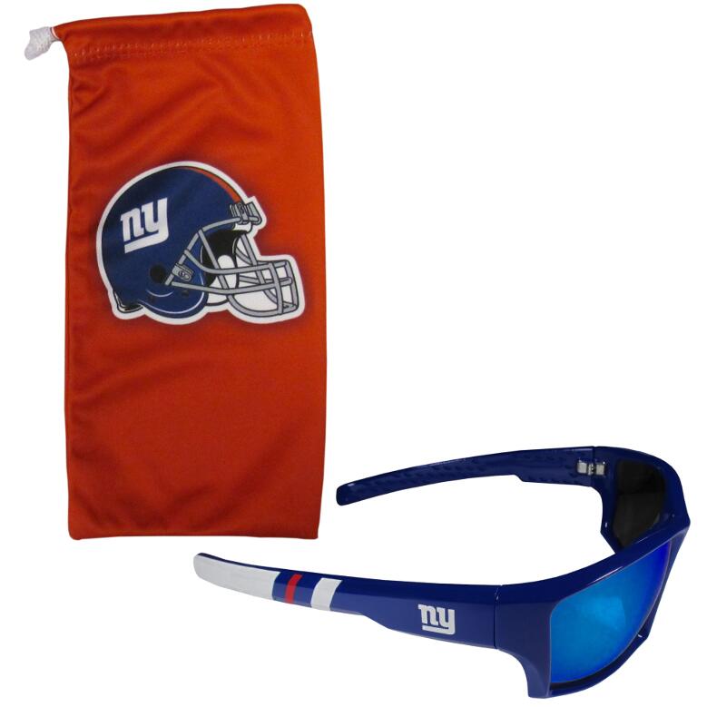 Be an icon of edgy style while you're in the stadium cheering your New York Giants to victory with our polarized wrap sunglasses that feature 100% UVA/UVB rating for maximum UV protection. The light-weight frames are built to last with flex hinges for comfort and durability which make them perfect for driving or just lounging by the pool. The colorful rubber grips on the arms of these fashionable sunglasses make them perfect for someone with an active lifestyle. Comes with a microfiber bag in team colors that features the team name on one side and the primary logo on the other side. Bag can be used as a screen cleaner.
